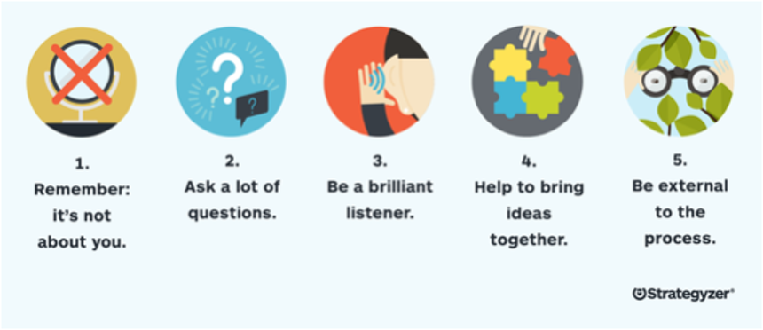 Een artikel van Kavi Guppta (Strategyzer) geeft de volgende vijf tips die ik toepas bij het faciliteren van uw gesprekken, workshops of bijeenkomsten: